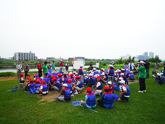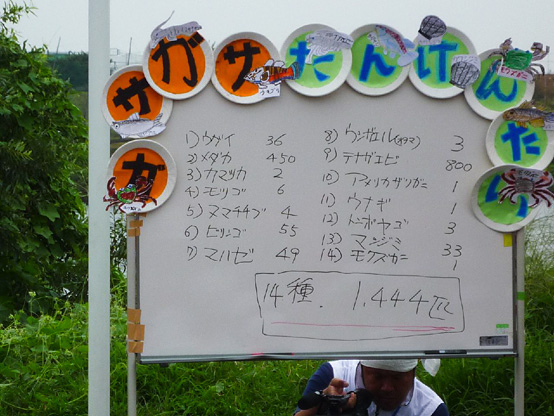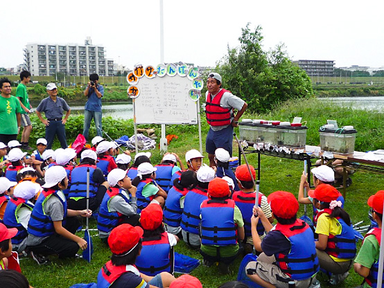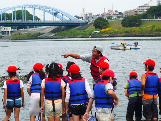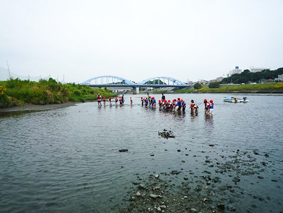 | 14:50 | がさがさ探検隊 開始 清掃の際に分けた3チームの選手に、事前申し込みで当選されたサポーターの皆さんのみが入水し、生物捕獲!! 多摩川をこよなく愛する俳優・中本賢さん指導のもと捕獲した生物種数を競争するゲームを3チーム対抗で行います!! 種類数が多いチームに賞品プレゼント。選手会提供品もあり!! |