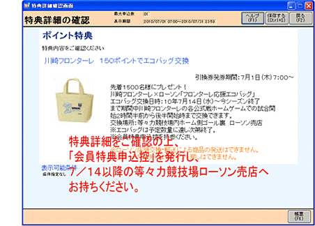 ※タオルマフラーと間違わないようご注意下さい! - (3)画面が発券画面に移動しますので、内容をご確認の上、レシートを発券してください。発券される「会員特典申込控(エコバッグ)」がタオルマフラーの引換券となりますので、大切に保管し、7月14日(水)からの交換場所である等々力競技場内ホーム側ゴール裏ローソン売店へお持ちください。