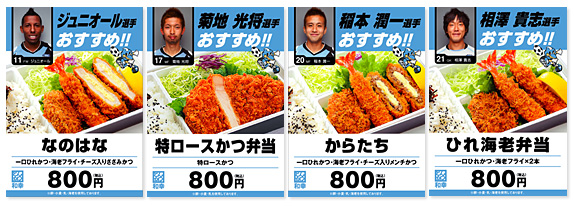 | 等々力市場にて | ◇販売場所 競技場内 バックスタンド10番ゲート付近「等々力市場」 ◇お弁当 ・キクおススメ「特ロース弁当」(80食) ・ザワおススメ「ひれ海老弁当」(80食) ・イナおススメ「からたち」(80食) ・ヴィトおススメ「なのはな」(80食) |