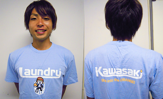 今回のデザインは、なんとLAUNDRY BOYがフロンターレ仕様に! そして、オレンジをかじっちゃっています。背中には「Bite into the ORANGE!(オレンジにかじりつけ!)」のメッセージ入り。