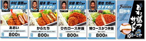 | フロンパークにて | ◇販売場所 等々力陸上競技場 緑地プール前広場「フロンパーク」 ◇お弁当 ・ケンゴおススメ「あおい」(一口ひれかつ・海老フライ・梅肉入り特ささみかつ) ・キクおススメ「特ロースかつ弁当」(特ロースかつ) ・イナおススメ「からたち」(一口ひれかつ・海老フライ・チーズ入りメンチかつ) ・アンドゥおススメ「ひれロース弁当」(一口ひれかつ・ロースかつ) ・謹製ひれ勝つサンドレギュラー ・謹製ひれ勝つサンドハーフ |