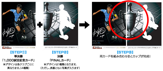 また、11月3日(水・祝)に国立競技場にて開催される2010Jリーグヤマザキナビスコカップ決勝では来場者全員に、表・裏それぞれに決勝進出クラブの選手1人ずつがデザインされた「2010JリーグヤマザキナビスコカップFINALカード」をプレゼントいたします。これらの準決勝・決勝で配布される両カードを組み合わせると、カード中央にデザインされたJリーグヤマザキナビスコカップが完成する仕組みになっています。