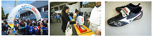 | ガラポン景品 | ◇特賞 中村憲剛選手サイン入りスパイク 1名 ◇プレミア賞 試合後、希望選手と記念撮影 3名 ◇選手賞 選手着用ファン感Tシャツ 5名 ◇1等 2011ホームユニフォーム 5名 ※その他、メガホン、カーサンシェードなど計300品 ![]() |