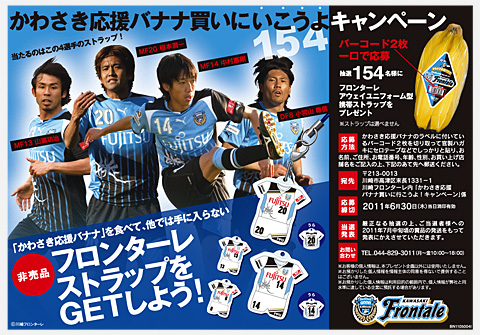 川崎フロンターレのスペシャルサプライヤーである「株式会社ドール」協力のもと、川崎中央青果株式会社が、バナナの販売を通して川崎フロンターレを支援し、また、力を合わせて地元・川崎市の活性化をしていきたいと考え、川崎市内の量販店にて展開中の「かわさき応援バナナ」。