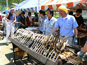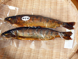 ■「山梨まいう〜物産展」企画その③ 多摩川の源流にある村「小菅村」の物産展を実施。キレイで冷たい多摩川の源流で育った新鮮なヤマメの塩焼きや、小菅村の名産品のチャ―ちゃんまんじゅうやこんにゃくなど販売。 ◇ヤマメの塩焼き:価格:400円