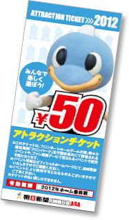 | 参加方法 | ◆スタジアムアトラクションチケットが必要 ◆1枚50円 ※2012年後援会員は3枚で100円 ![]() ※アトラクションチケットは当日販売も行います。 |