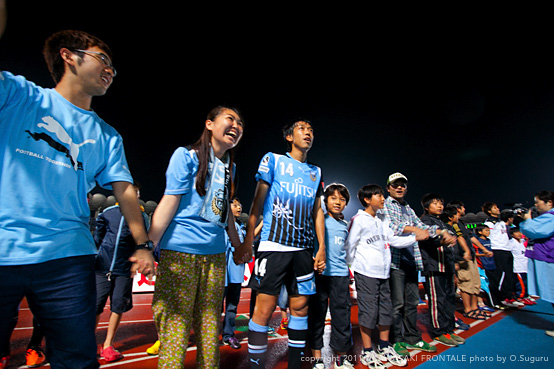 川崎フロンターレが勝利時、試合直後にピッチ横トラック上にて、選手とハイタッチし、ともに万歳三唱をします。