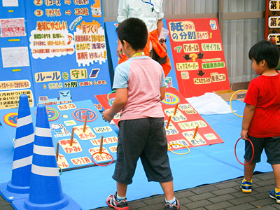 | 内容 | ◆昔懐かしい「輪投げ」を通して、参加していただいた方々に、楽しく遊びながら、 分別ルールと排出マナーを学んでいただくゲームです。全問正解者には賞品を差し上げますので、奮ってご参加ください。 ![]() |