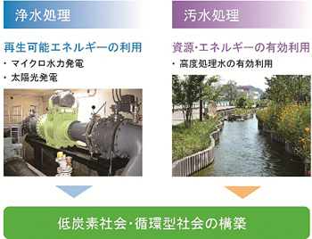上下水道局では、低炭素社会、循環型社会の構築をめざして、温室効果ガス排出量の削減や資源・エネルギーの循環促進などに取り組んでいます。