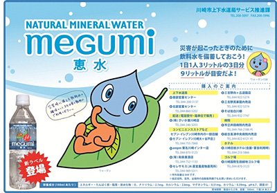 ![]() 川崎市の特徴の1つとして、取水から配水まで地形の高低差を利用した「自然流下」により、省エネ化を実現しています。 ![]() また、高低差で発生するエネルギーを利用したマイクロ水力発電や、下水を高度処理した水を有効利用して、水と緑に親しめる憩いの場を作るなど各種の取組を推進しています。 ◆生田の天然水「恵水」の試飲及び販売 ![]() ◆簡単なクイズにお答えいただくとオリジナルうちわをプレゼントします。 ◆パンフレット、チラシ等の配布 |