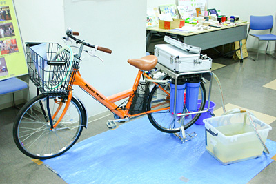 シクロクリーンは、塩素殺菌機能付き自転車搭載型緊急用浄水装置です。 地震などの災害による断水時に、河川や池・学校のプール・防火用水・風呂の残り湯などを水源に、自転車を漕ぐだけで、1時間に180人分の飲料水を造り出すことができます。 |