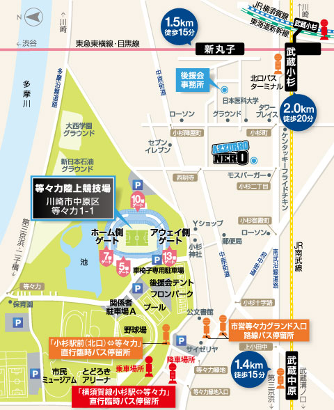 6/23横浜FM戦、6/30神戸戦において、JR武蔵小杉駅横須賀線口から等々力陸上競技場への直行臨時バス(有料)が運行されることになりましたので、お知らせ致します。