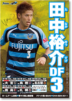 2012シーズンのスケジュールポスター第3弾(田中裕介選手バージョン)の完成を記念して、オフィシャルショップ「アズーロ・ネロ」、フロンターレのフットサル場「フロンタウンさぎぬま」、武蔵小杉駅前のケンタッキーフライドチキンインレット小杉店、溝ノ口駅前のケンタッキーフライドチキン溝ノ口店、東急ハンズ川崎店、フロンターレローソンの全6店舗にて、7月21日(土)より「スケジュールポスタープレゼントキャンペーン」を実施致しますので、お知らせ致します。