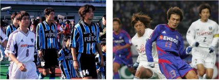 ※[左写真]1999年「第4回多摩川クラシコ」両クラブのキャプテンをつとめる藤山竜仁(8番)、中西哲生(14番)