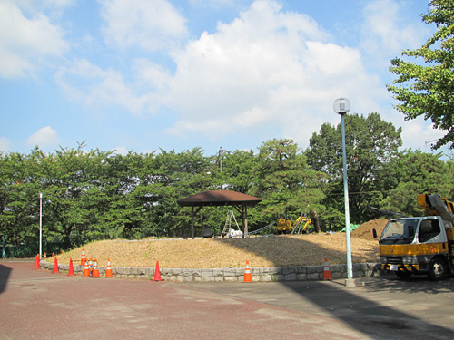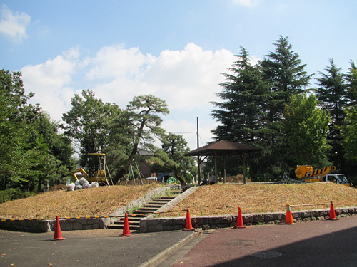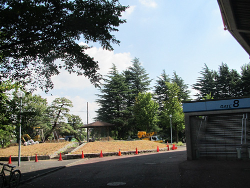 今シーズン終了後から始められる等々力陸上競技場の改築工事に伴い、川崎市により、ホームゴール裏の場外にある築山の位置に仮設倉庫を設置する工事が行われます。