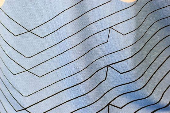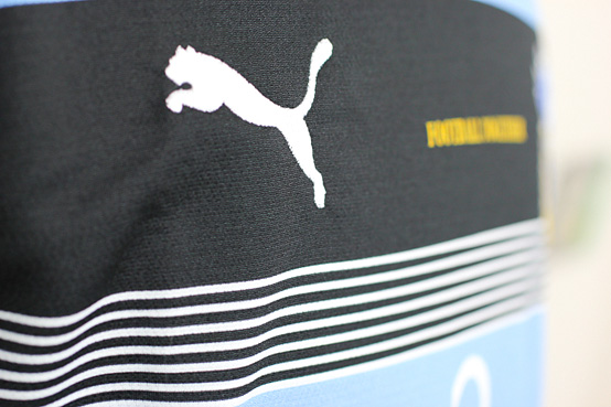素材は2012年同様、「PUMA DRY INNOVATION2012」を使用。表面を拡散ポリエステル、中央を吸放湿ベンベルグ、肌面を吸水ポリエステルの3層構造による新しいドライ機能を持ち、より撥水性と吸水性に優れたつくりとなっています。また、生地の裁断屑や古着、ペットボトル等を原料にしたリサイクル糸の「エコ糸」を使用し、石油の消費量や埋め立てのごみの量を少なくすることができる、環境にも配慮したつくりです。そして、胸元から裾にかけて入っている印象的なラインの集合体は、2013年のプーマの「POWERCAT(パワーキャット)」というプロダクトラインのデザインモチーフを使用しています。これは古代文明時代に造られたとされる建築物である「ピラミッド」をもとにデザインされました。また、両サイド脇の切替デザインは、スパイクの「POWERCAT(パワーキャット)」の「パワーシューティングテクノロジー」のパーツデザインをモチーフにしています。