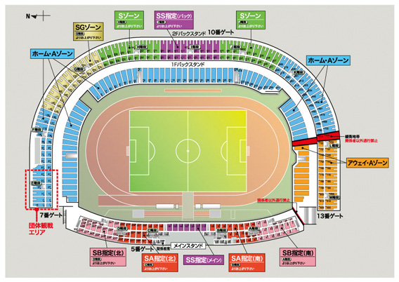 | ◇前売券 ・席割図・価格表・購入方法一覧 ※ホーム側・アウェイ側ともに、ゴール裏1階席は「立見席」となっております。 ※券面の記載と異なるエリアでの観戦はできません。 ※開門時より、2階席を含む全スタンドを開放致します。 ※「アウェイ・Aゾーン」とその他のエリアとの境界は、どちら側からも通り抜け禁止です。いかなる事情があっても往来できません。 ・ホームゲームチケット販売状況 ・Lコード「30186」、Pコード「592-720」、セブンコード「015-636」 |