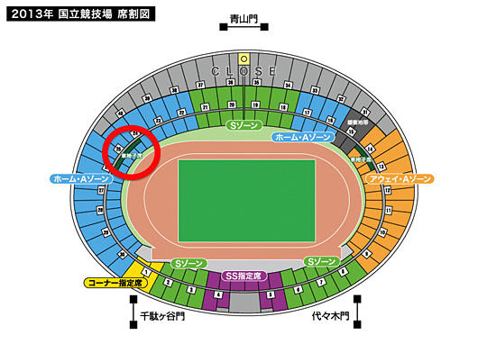 国立競技場の車椅子席は、「ホーム・Aゾーン、アウェイ・Aゾーンのそれぞれゴール裏スタンドにのみ」設置しております。