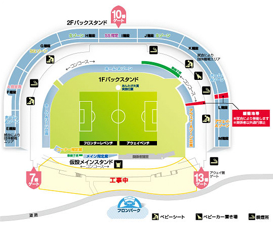 ■席割・入場料・入場方法について2013シーズンの席割・入場料は仮設スタンドの運営に伴い変更いたします。 『7番ゲート入場待ち列順番決め抽選』(事前申込制)は、2012シーズンと同様の方法で運用させて頂きます。 |