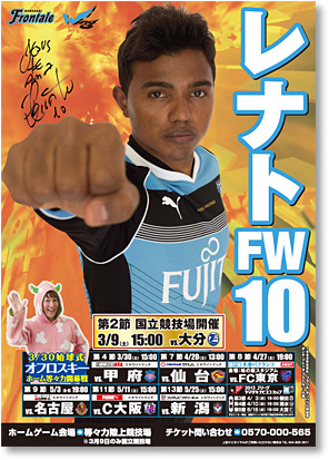 2013シーズンのスケジュールポスター第1弾(レナト選手バージョン)の完成を記念して、オフィシャルショップ「アズーロ・ネロ」、フロンターレのフットサル場「フロンタウンさぎぬま」、武蔵小杉駅前のケンタッキーフライドチキンインレット小杉店、東急ハンズ川崎店、フロンターレローソンの全5店舗にて、2月22日(金)より「スケジュールポスタープレゼントキャンペーン」を実施致しますので、お知らせ致します。