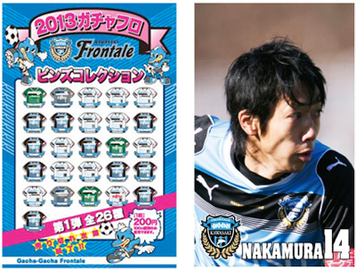 フロンターレのガチャガチャ=ガチャフロ。ユニフォーム型ピンズ第1弾は全26種類。どの選手が出るかは開けてみてのお楽しみ。1回200円です!!そして今年は選手直筆サイン入りミニペナントが当たるチャンスありです!!