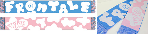 オフロスキーをイメージさせるピンクベースとオフロンスキーをイメージさせるサックスベースのリバーシブルなニットマフラー。オフロスキー側にはオフロワニ、オフロンスキー側は雲をイメージさせるFRONTALEの文字が。