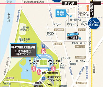 | ◇等々力陸上競技場へのアクセス 等々力陸上競技場付近、等々力緑地内には、一般有料駐車場は300台程度しかございません。試合当日は、公共交通機関のご利用をお願い致します。※武蔵小杉駅周辺には、数ヶ所、一般有料駐車場がございます。 |