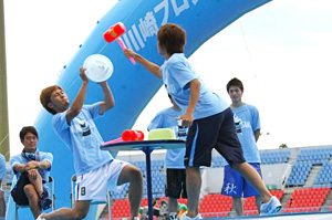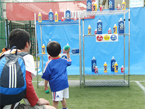 競技場ホームゴール裏付近に現れた巨大な池。この池に放たれたマグネット付きの大量ガチャガチャカプセルを時間制限内にマグネット針がついた竿で釣りあげるゲームです。カプセル内には、賞品名が書かれた紙が入っているので、たくさん釣りあげれば賞品も大漁、いや大量に!池の中には、大物=豪華賞品名が書かれたカプセルがうようよ泳ぐ「内堀」と、賞品は平凡ですが、結構簡単に釣り上げられる「外堀」があるので、大間のマグロばりの大物を一尾集中で釣り上げるのもよし、小物を大量に釣り上げるのもよし、アナタなりの釣りかたでご参加ください(ただしカプセルの中には「スカ=はずれ」もあるのでご注意を)。