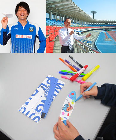 写真のように等々力陸上競技場の2階から組み立て式ヒコーキを飛ばして(写真は日本紙飛行機協会の方で当日も指導にきてくれます!)1階に設置された「等々力エアポート」に見事ランディングできれば、イッツコムの素敵な賞品をプレゼント。組み立て式ヒコーキは、昔、駄菓子屋さんで売っていた発泡スチロール製の組み立てヒコーキが進化した「日本紙飛行機協会認定」の高性能モデルです!当日は、このヒコーキにあなたオリジナルのペインティングを施し、世界にひとつだけのデザインのヒコーキを等々力の空高く飛ばし、等々力エアポートへの着陸を目指してください! ※上記の写真のヒコーキの翼(当日は白地)にオリジナルでペインティングしていただきます。