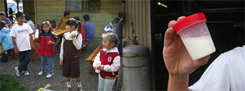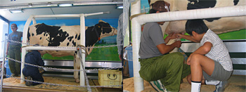 乳牛専用の搾乳トラックで、実際に乳しぼり体験。 |