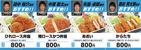 | とんかつ和幸 | ![]() ◇選手セレクト弁当:各800円 ◇ひれ勝つサンド(レギュラー):600円 ◇ひれ勝つサンド(ハーフ):300円 |