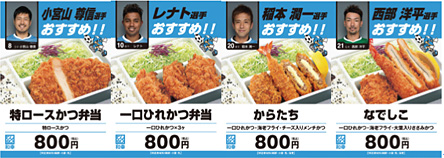 | 物販③ | ◆創業昭和33年!川崎生まれ川崎育ちのとんかつ和幸特製弁当 今シーズンも川崎生まれ、川崎育ち、川崎が全国に誇るとんかつの名店「とんかつ和幸」販売店が登場!選手がセレクトしたおススメお弁当を販売します! ![]() ◇選手セレクト弁当:各800円 ◇謹製ひれ勝つサンド(レギュラー):600円 ◇謹製ひれ勝つサンド(ハーフ):300円 ◇キャベツメンチ(2ヶ入り):350円 ◇ジャンボひれかつ串:300円 ◇ジャンボメンチかつ串:300円 |