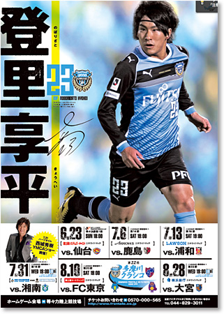 2013シーズンのスケジュールポスター第2弾(登里享平選手バージョン)の完成を記念して、オフィシャルショップ「アズーロ・ネロ」、フロンターレのフットサル場「フロンタウンさぎぬま」、武蔵小杉駅前のケンタッキーフライドチキンインレット小杉店、東急ハンズ川崎店、フロンターレローソンの全5店舗にて、6月23日(日)より「スケジュールポスタープレゼントキャンペーン」を実施いたしますので、お知らせいたします。