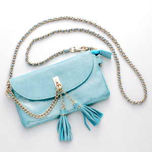 斜め掛け、クラッチバッグ使い、ポーチとしてなど、用途は様々なマルチデザインです。前面のタッセルとチェーンが豊かな表情を出してくれています。中は仕切り兼用ファスナーポケットがあり仕分けしやすいデザインになっております。