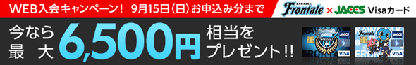 キャンペーン期間中にフロンターレジャックスVisaカードへご入会いただくと最大6,500円相当をプレゼント!!お持ちでない方はこの機会に是非、お手続きください。