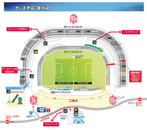 | 開園時間 | 15:30(試合開始4時間)~19:00 ※アトラクションはキックオフ30分前まで ※フロンパークを開催するにあたり、競技場各入場ゲートにてスタンプによる再入場対応あり。 (キックオフ30分前まで) |