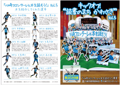 【2】フロンターレ読書推奨リーフレットの配布フロンターレの選手が選んだ推薦図書を掲載したリーフレット「川崎フロンターレと本を読もう!Vol.5」を市内市立図書館全館、市内小中学校、等々力陸上競技場(秋予定)等で配布・設置します。(全7万部作成)