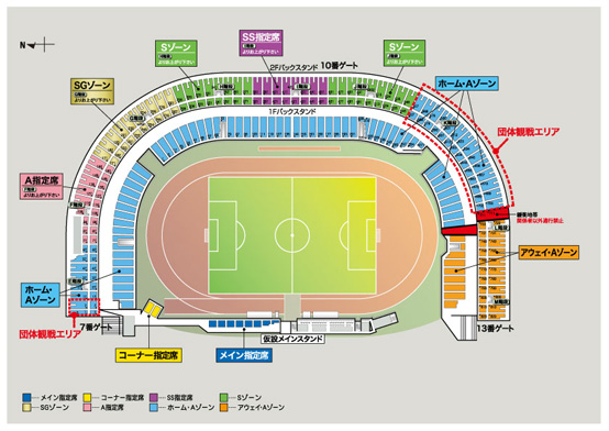| ◇前売券 ・席割図・価格表・購入方法一覧 ※ホーム側・アウェイ側ともに、ゴール裏1階席は「立見席」となっております。 ※券面の記載と異なるエリアでの観戦はできません。 ※開門時より、2階席を含む全スタンドを開放いたします。 ※「アウェイ・Aゾーン」とその他のエリアとの境界は、どちら側からも通り抜け禁止です。いかなる事情があっても往来できません。 ・ホームゲームチケット販売状況 ・Lコード「30185」、Pコード「592-720」、セブンコード「021-219」 |