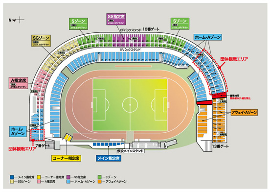 | ◇前売券 ・席割図・価格表・購入方法一覧 ※ホーム側・アウェイ側ともに、ゴール裏1階席は「立見席」となっております。 ※券面の記載と異なるエリアでの観戦はできません。 ※開門時より、2階席を含む全スタンドを開放いたします。 ※「アウェイ・Aゾーン」とその他のエリアとの境界は、どちら側からも通り抜け禁止です。いかなる事情があっても往来できません。 ・ホームゲームチケット販売状況 ・Lコード「30186」、Pコード「592-720」、セブンコード「021-222」 |