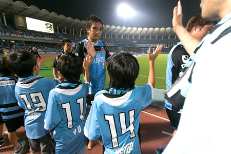 川崎フロンターレが勝利時、試合直後にピッチ横トラック上にて、選手とハイタッチし、ともに万歳三唱をします。