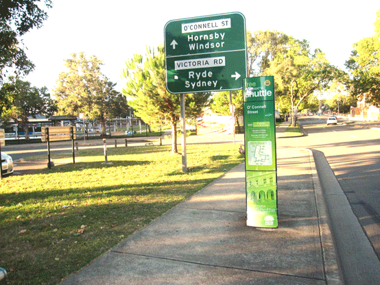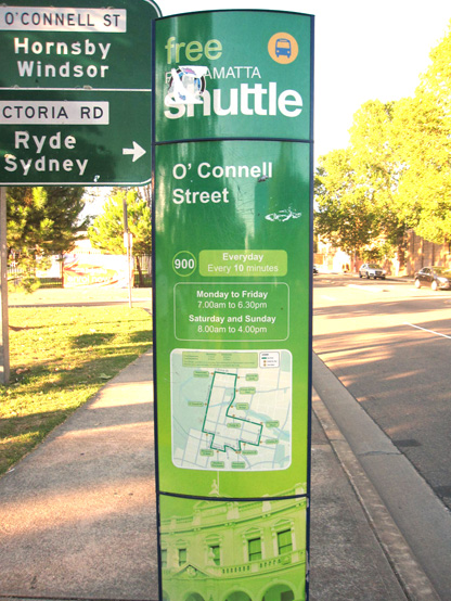 ●フェリー乗降場「パラマッタ」からは、乗降場前にあるバス乗り場「パラマッタ・ワーフ(Parramatta Wharf)」で無料シャトルバス(緑色)に乗車、「オコネル・ストリート」で下車し目の前、または徒歩約20分。