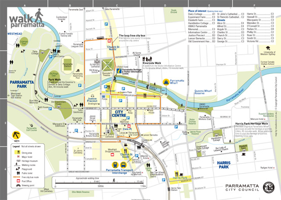 ●「パラマッタ駅」からは、駅前にあるバス乗り場「パラマッタ・インターチェンジ(Parramatta Interchange)」で無料シャトルバス(緑色)に乗車、「オコネル・ストリート(O’Connel St)」で下車し目の前、または徒歩約20分。