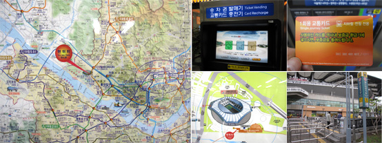 ●ソウル(Seoul)の「金浦(キンポ/Gimpo)国際空港」からKORAIL空港鉄道で「ソウル駅」行きに乗車し「デジタルメディアシティ(Digital Media City)駅」で下車(約9分)、地下鉄6号線「合井(Hapjeong)駅」・「烽火山(Bonghwasan)駅」方面行きに乗り換えて「ワールドカップ競技場(World Cup Stadium)駅」にて下車(約3分)、出口「1」から地上(バックスタンド側)へ。計1,250Won。
