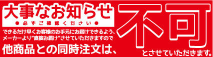 ・できるだけ早くお客様へお届けするため、メーカーより直接お客様へのお届けとなりますので、他商品との同時注文はお受け致しかねます。