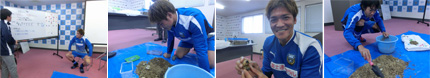 カブトムシ幼虫の飼育方法のレクチャーを受ける大久保、ケンゴ両選手