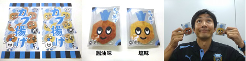 川崎区の煎餅製造会社「堂本製菓」に協力を仰ぎ、新カブキャラクターの形をしたカブ揚げ煎餅を限定販売いたします。ポイントは「カブキ揚げ」ではなく、「カブ揚げ」というところです!