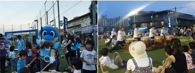 野川親子太鼓「大地」による和太鼓体験会及び演奏会を行います。体験会はどなたでもご参加できます。盆踊りの前座となる演奏会では、和太鼓の迫力ある音がフットサルコート全体に響きます。