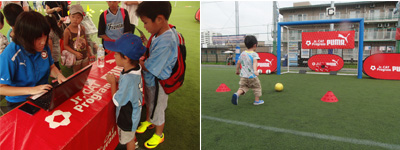 キックターゲット、20m走、シュートスピード測定を実施します。アトラクション終了後、参加者に測定結果をお渡しします。