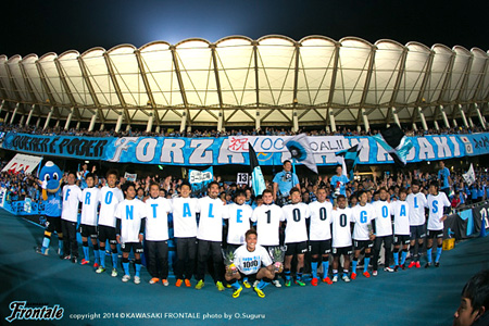 川崎フロンターレは、Jリーグに参入した1999年から2014年3月28日J1リーグ第5節名古屋グランパス戦での大久保嘉人選手のゴールにより、J1・J2リーグ戦通算1000ゴールを達成しました。