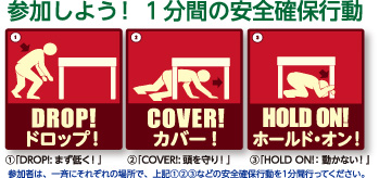8月16日18:00頃、地震の発生を想定し、場内アナウンスを合図に下記の通り自らの身を自ら守る「1分間の安全確保行動」をとっていただきますので、ご協力の程よろしくお願いします。